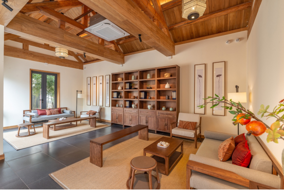 拔槊泉村以拔槊泉聞名,廓廬的建築設計秉承漢唐的建築風格和因地置景的精髓,並與現代簡約禪意風格相結合,一磚一瓦一桌一器的擺放都充滿了詩意。