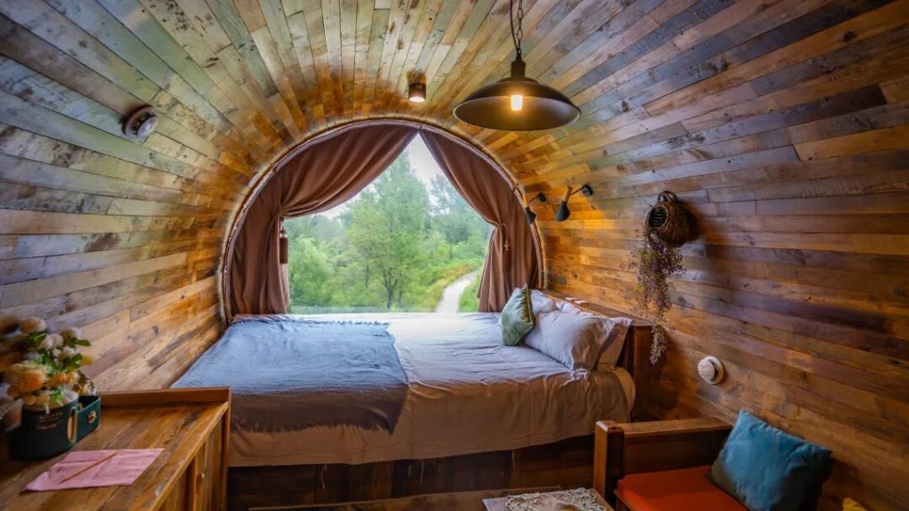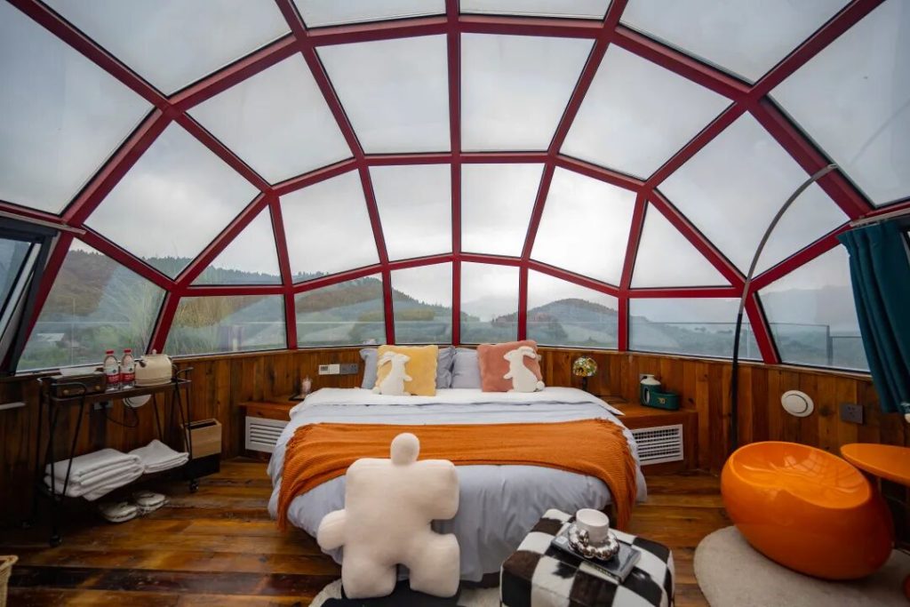露營、房車、玻璃屋、水泥管、童話屋……在若穀空境雲舍,不同場景之間任意穿越,各有各的趣味。