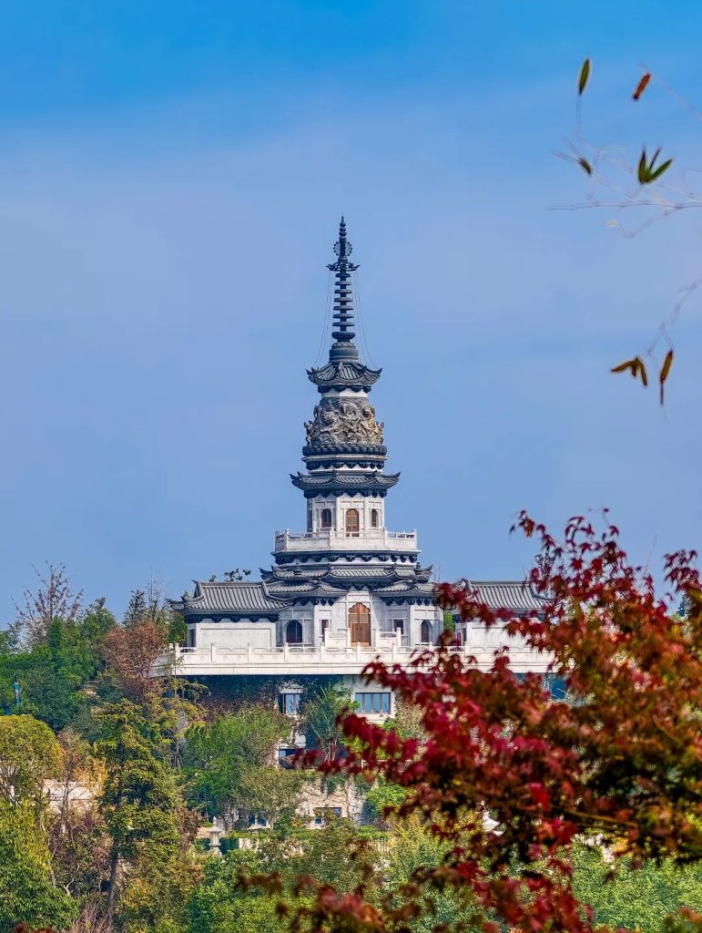 吃完午飯後,順著人流的方向上山,遠遠望去,山間那座白簷黑瓦的塔,藏在銀杏林裏半遮半掩,石階上站滿了賞秋的人,寺院門口的古銀杏剛染了淺淺的黃色,反倒是眼前一棵小紅楓的葉子已經紅透,拿它作前景,拍了張充滿秋日氛圍感的“照騙”。