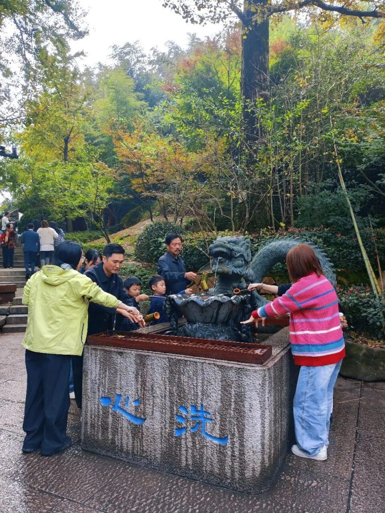 再往裏走一段,便是徑山寺山門了。還沒等“天下徑山”的金字招牌撞進視線,嘈雜的人潮聲浪先湧了過來。香爐前人擠人:有忙著點香的、有忙著向各個方向朝拜的、有拜完忙著往裏插香的……鏡頭裏滿是人頭與香火氣。洗心池邊也是人來人往,接水洗手的人絡繹不絕,想拍一張空景照是沒希望了。