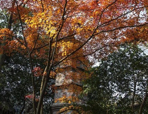吃完午飯後,順著人流的方向上山,遠遠望去,山間那座白簷黑瓦的塔,藏在銀杏林裏半遮半掩,石階上站滿了賞秋的人,寺院門口的古銀杏剛染了淺淺的黃色,反倒是眼前一棵小紅楓的葉子已經紅透,拿它作前景,拍了張充滿秋日氛圍感的“照騙”。