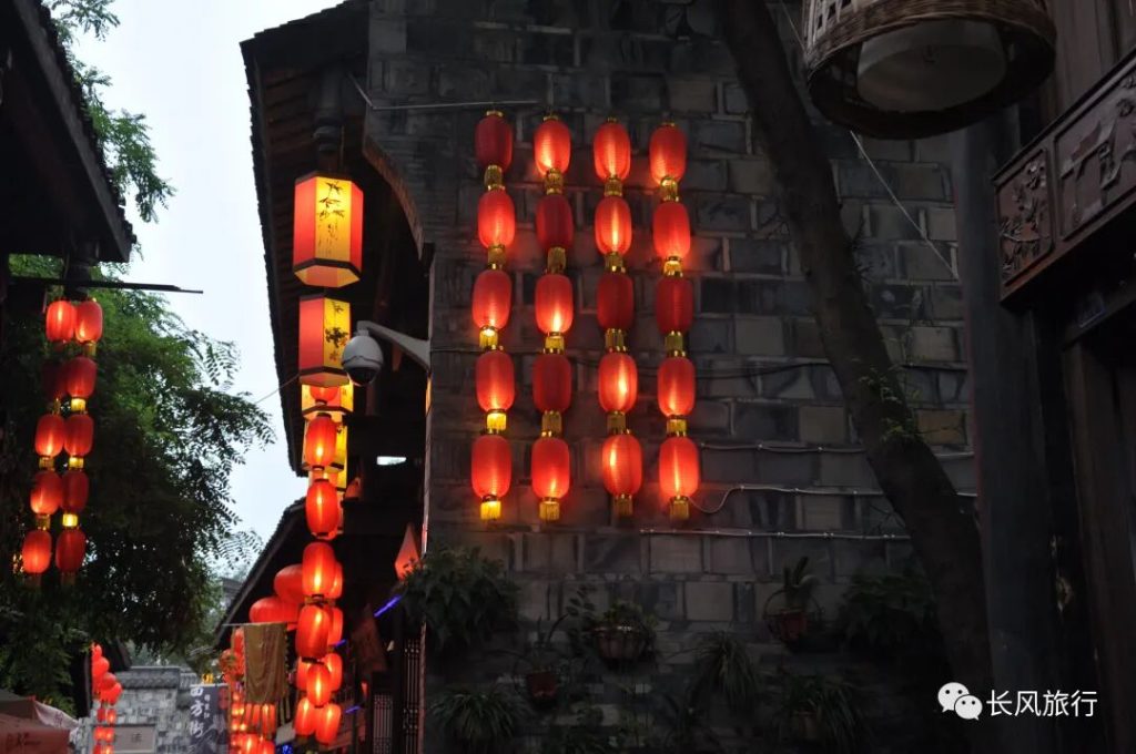 街道兩旁是木結構的傳統四川民居,飛簷、鬥拱、廊柱,古色古香。即便不是為了美食而來,也可以在這裏漫步,感受傳統文化氣息。若是日暮時分,古街上燈影綽綽,更顯繁華。