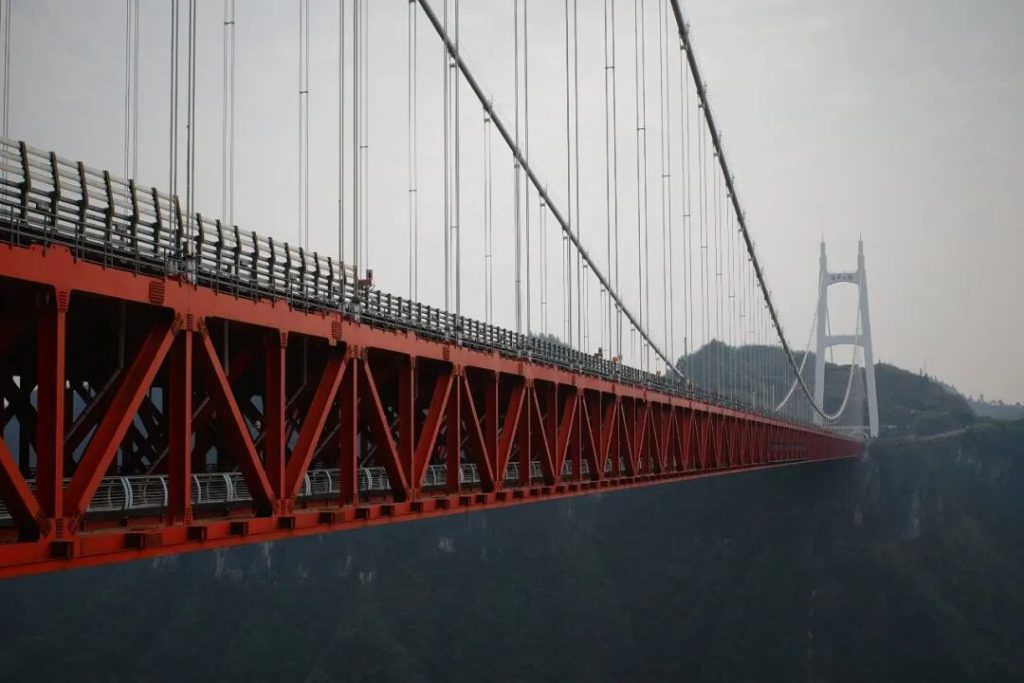 它不像普通的橋那樣“架”在地上,而是像一根巨大的鋼索,直接從三百多米高的兩座山頭之間“甩”了過去。