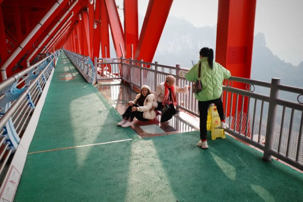 腳下有一部分是透明玻璃,低頭就是德夯大峽谷的深淵,而你自己正身處雲端,頭頂的車流在另一層橋面呼嘯而過,這種空間交錯感非常奇特。