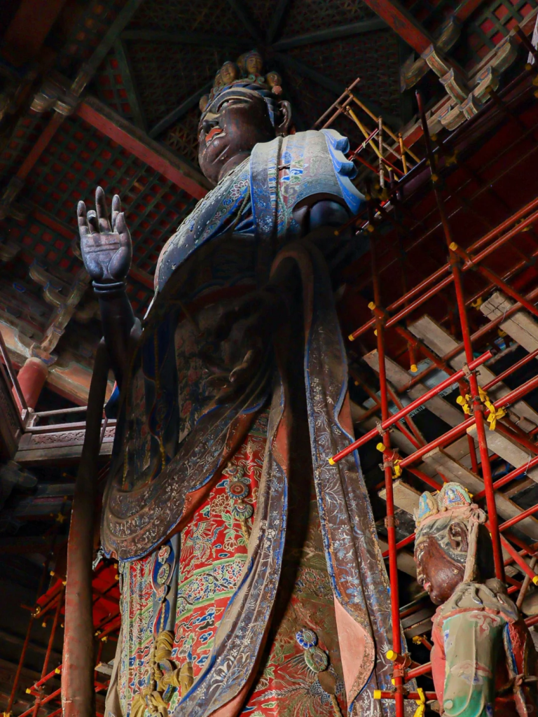 觀音閣第二絕則是,觀音閣內高達16.08米的十一面觀音塑像,它是我國現存最大的泥塑站像之一。