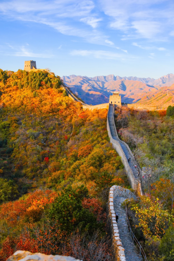 而到了秋天,則是火紅一片。站在長城之巔,盡情俯瞰整個山穀,紅葉滿山,層林盡染,仿佛一幅濃墨重彩的山水畫卷。