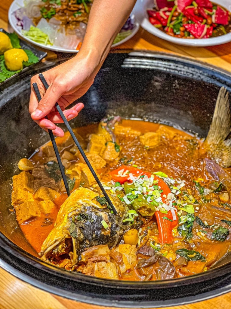 鐵鍋燉魚的魚多取自於橋水庫的野生魚,肉質鮮嫩緊實,沒有絲毫的土腥味 。