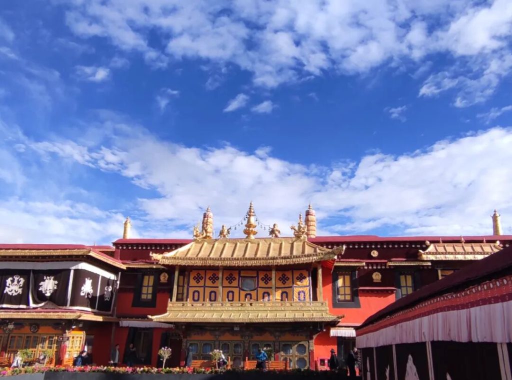 迎著初升的太陽,走在寬闊的街道,拉薩的天空藍得像廣袤無垠的絲綢,沒有一根雜線。潔白的雲朵,一大團一大團的,列成對、排成行,形成一個有規律的矩陣,仿佛是歡迎遠道而來的八方遊客。在那個十字路口等過紅燈,便是著名的八廓街了。漫步在這條街上,穿著藏服的人漸漸多了起來,或男或女、或老或少,他們手裏都會持有一條長長的珠串——盡管材質有所不同,但信仰卻同氣連根。沿著八廓街一直向前,大概走了七八分鍾,樸素靜謐的大昭寺赫然映入眼簾。