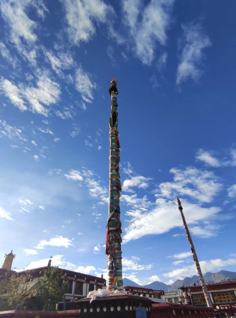 這是矗立在大昭寺門前的吉祥經幢。一面欣賞它的高聳入雲,一面情不自禁繞著四方基座轉了三匝——在信仰面前,人類是那么的渺小。這使我驀然想起那句古詩:“人生寄一世,奄忽若飄塵。”
