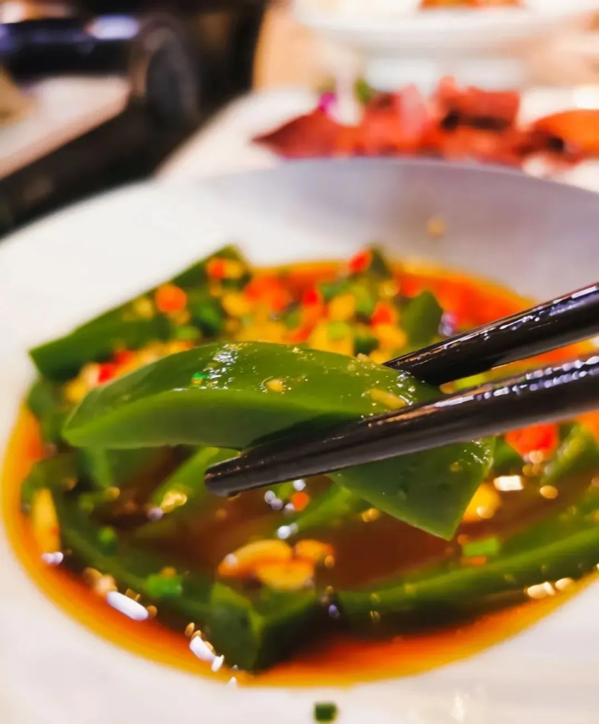 翡翠涼粉取材於巫山特有的 "臭黃荊" 樹葉,碧綠晶透的涼粉,澆上青花椒油的馥鬱麻香、糊辣殼的醇厚香辣,再撒上一把蔥花、香菜提味,輕輕攪拌,讓每一絲涼粉都裹滿料汁。