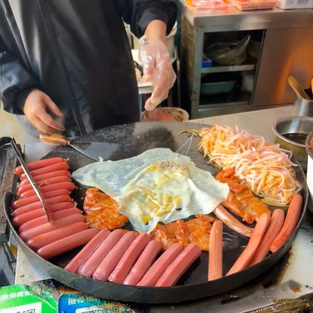 攤薄的面皮,與熱油中煎至金黃的雞蛋相遇,再刷上一層秘制辣子油,隨後加入煎熱狗、煎火腿,撒上翠綠的香菜,再包裹上土豆絲、裏脊等豐富食材,最後裝袋。一口咬下去,松軟的面皮與多樣的內餡在口中碰撞,辣子油的香味瞬間迸發,那豐富的口感,讓人直呼"人生值得"!