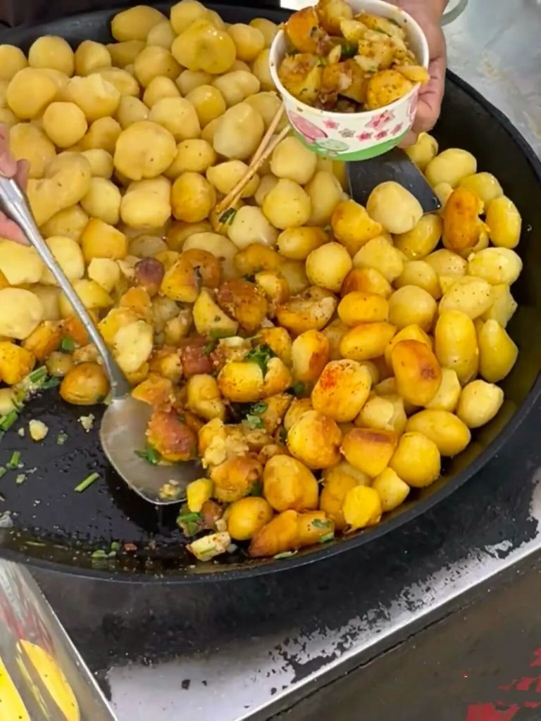 炕洋芋用獨特的方式煎制,洋芋煎至外皮金黃焦香,內裏軟糯綿密,撒上特制的調料粉,有香辣、麻辣等多種口味可選,每一口都散發著濃鬱的土豆香氣。