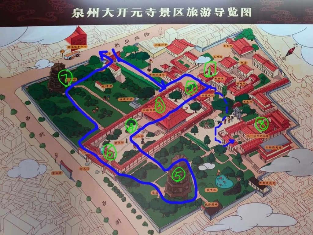 西門進入——1.藏經閣——2.甘露戒壇——3.大雄寶殿——4.拜庭——5.鎮國塔——8.弘一法師紀念館(我們實際沒進去,但門口有個“禪”字,特別好拍)——6.山門——7.仁壽塔