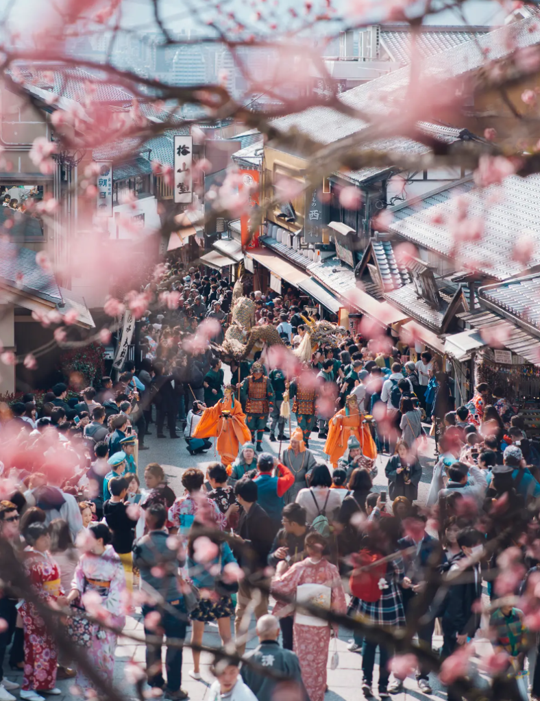 櫻花與清水舞台的結合構成了極具代表性的京都春景,尤其是清水舞台下方的街道也因為春天的到來而充滿了節日氣氛。
