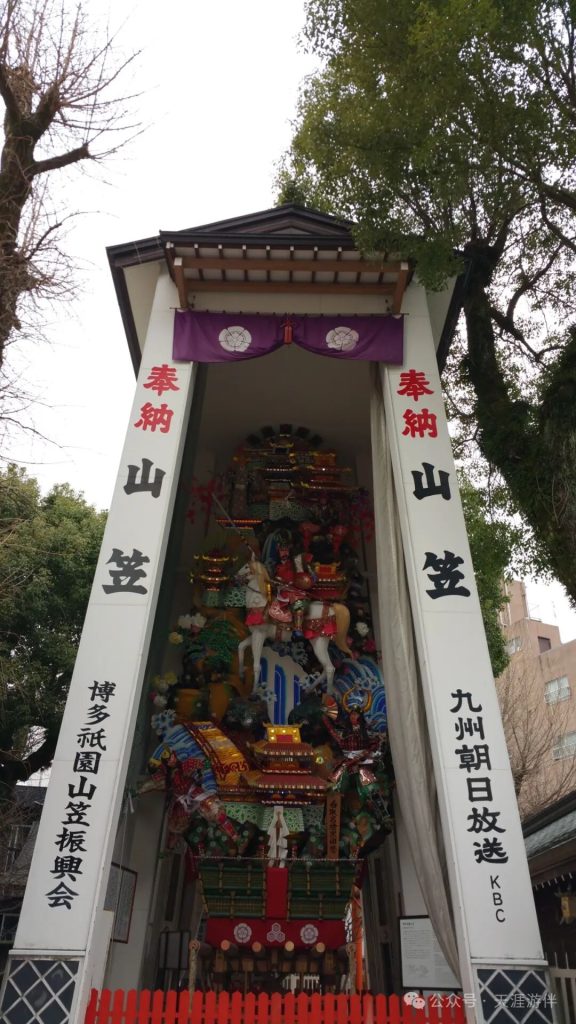 不過櫛田神社最有看頭的是展示在院內的山笠(神轎)。這個神轎是每年7月的夏季祭典“博多祇園山笠”時奉獻給神明的。神轎每年都會重新打造,裝飾著與博多地區有淵源的武士或古老傳說,也有動漫主題人物,可以仔細看看有沒有是你認識的喲。