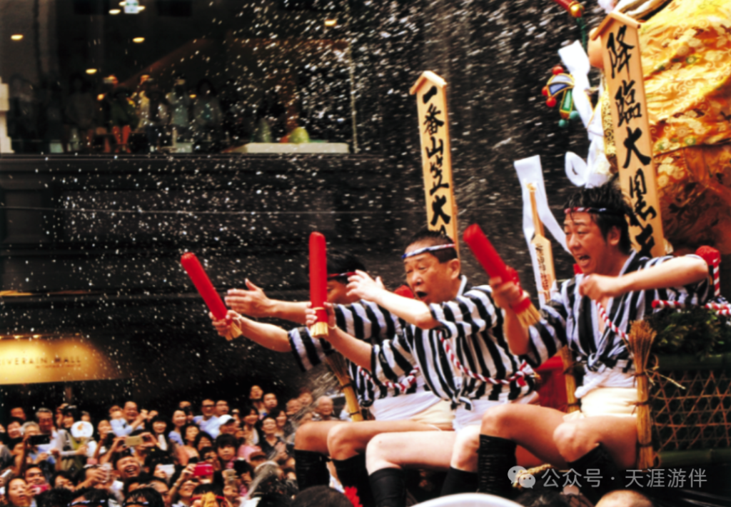 最後再說說博多祇園山笠,這項祭典每年7月10日開始就有一系列活動在福岡展開,到7月15日達到高潮,即名為“追山”的神轎競跑。淩晨4點59分,第一座神轎出發,賽道全長5公裏。參加比賽的隊伍共有七支,分別代表博多的一個曆史性街區。每支隊伍都要花好幾個月制作神轎,並為比賽作准備。每輛神轎高度都超過10米,重達1噸,上面還要坐兩到三位“台山”指揮,由約30名身著傳統腰布的壯年男子同時抬起。“追山”的體力消耗非常大,每3-4分鍾便需要換人,評判的標准不單單是速度,隊員在奔跑時還要表現出雄偉而優雅的儀態。