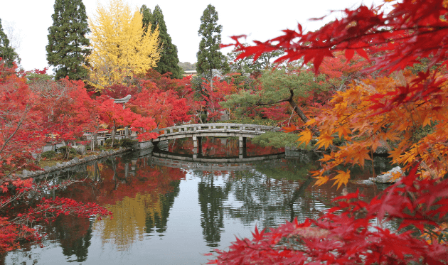 境內約3000株楓樹在秋天逐漸染紅,放生池四周的紅葉倒映在水面上,鋪展開一幅動人的畫卷。枝垂的紅葉、散落在苔坪上的落葉層層疊疊,把庭院渲染得格外深邃。