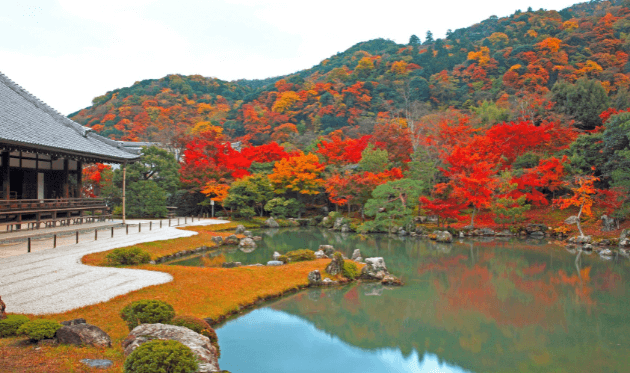 寺院以曹源池庭園最為知名,借嵐山為背景,霜葉鋪滿山坡,池水映照紅葉,景色如繡。