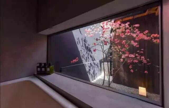 民宿中最大膽的設計莫過於浴室,透過浴缸旁的巨大玻璃窗,即可欣賞庭院裏的美景,宛如身處天然溫泉。