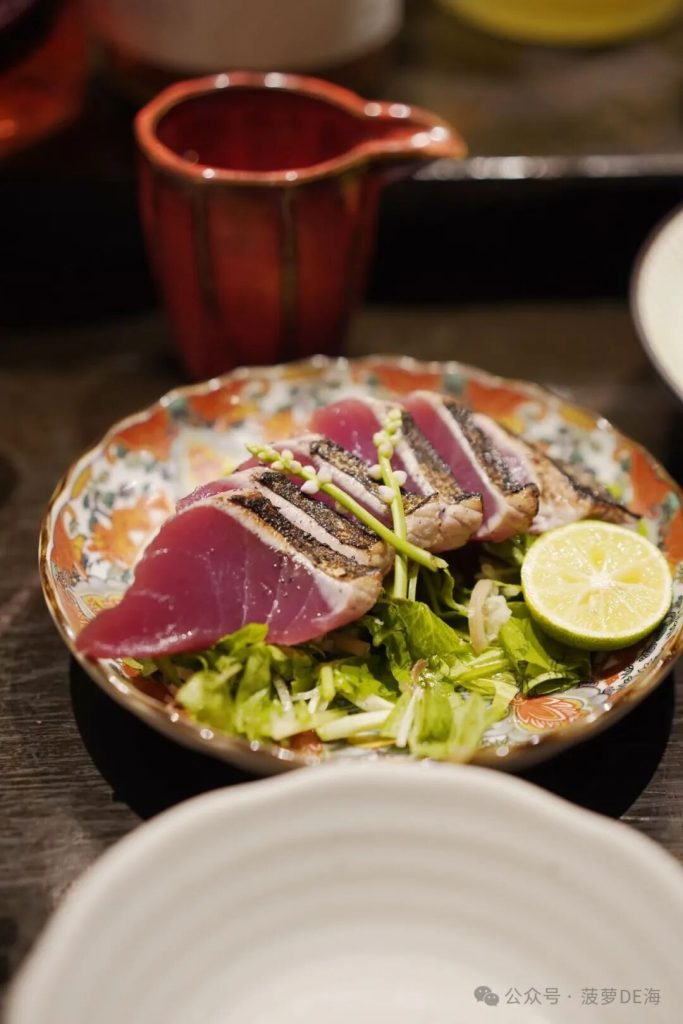 早春和初秋都是吃鰹魚的時候,秋日的鰹魚有與春日不同的風味,油脂更厚實豐腴,表面炙烤後形成焦脆的外皮,搭配酸橘汁來品嘗。