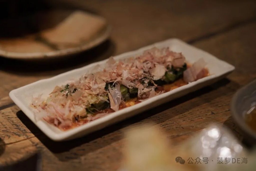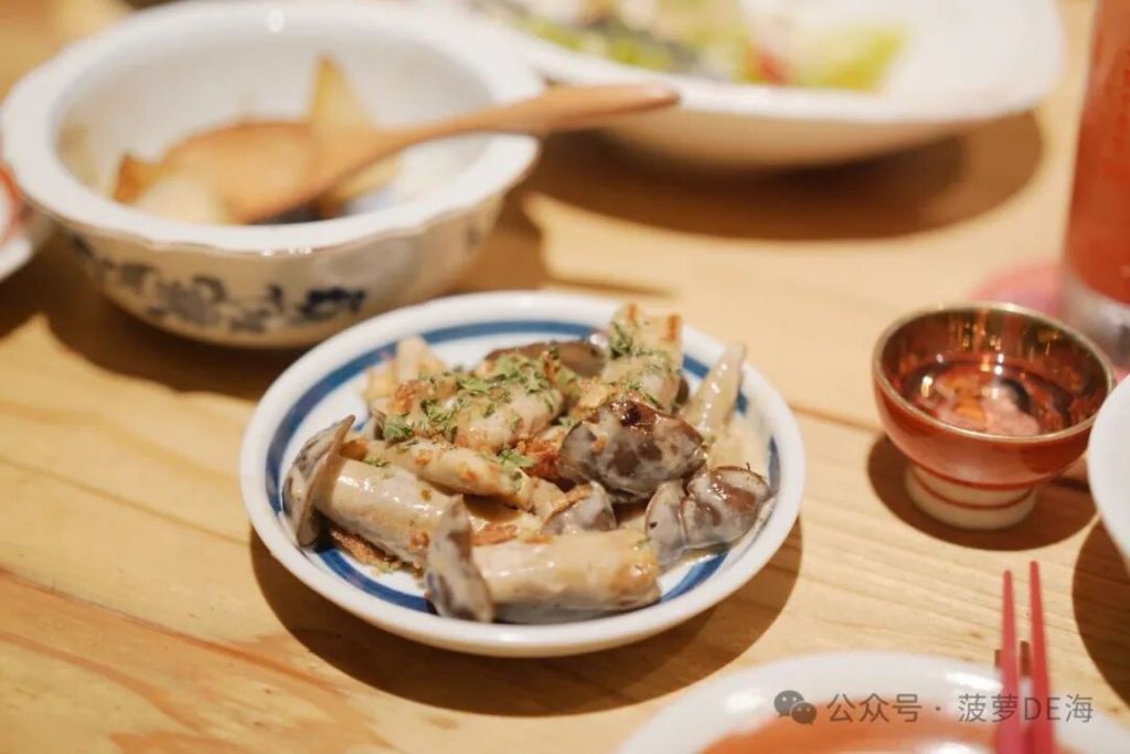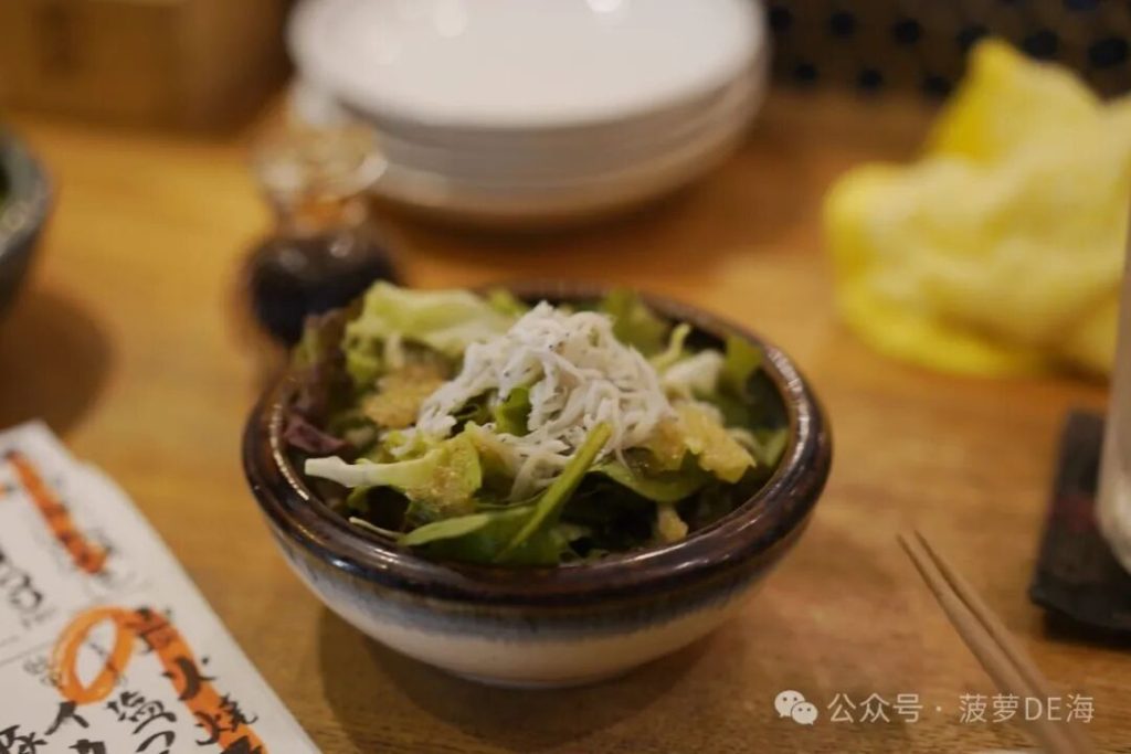 這家提供五百日元的小菜,今年是海蜒蔬菜沙拉。海蜒在舟山海域也很常見,通常會曬成幹,新鮮吃很細嫩,配上油醋汁清爽。