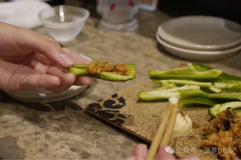 生青椒搭配肉味增和蛋黃醬。生青椒完全沒有辛辣感,反而清甜。好一道開胃菜。