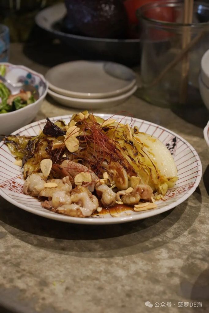 烤卷心菜,春天的卷心菜格外甜嫩又多汁,配上牛腸和蒜片。牛腸的油脂幾乎不去除,爆開滿嘴的奶香。