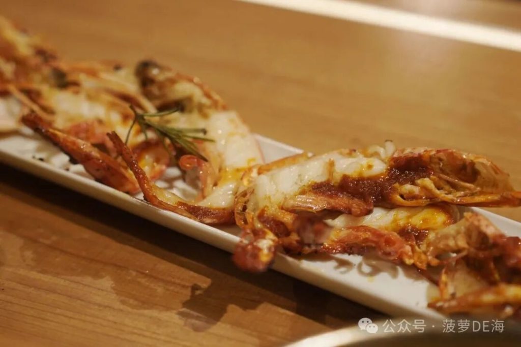 紅蝦剖對半焗烤,配上類似於“蝦醬”的醬汁,鮮中帶甜。牛肉焗烤後搭配面包片,鹹甜調味。這兩道都很適合配酒。