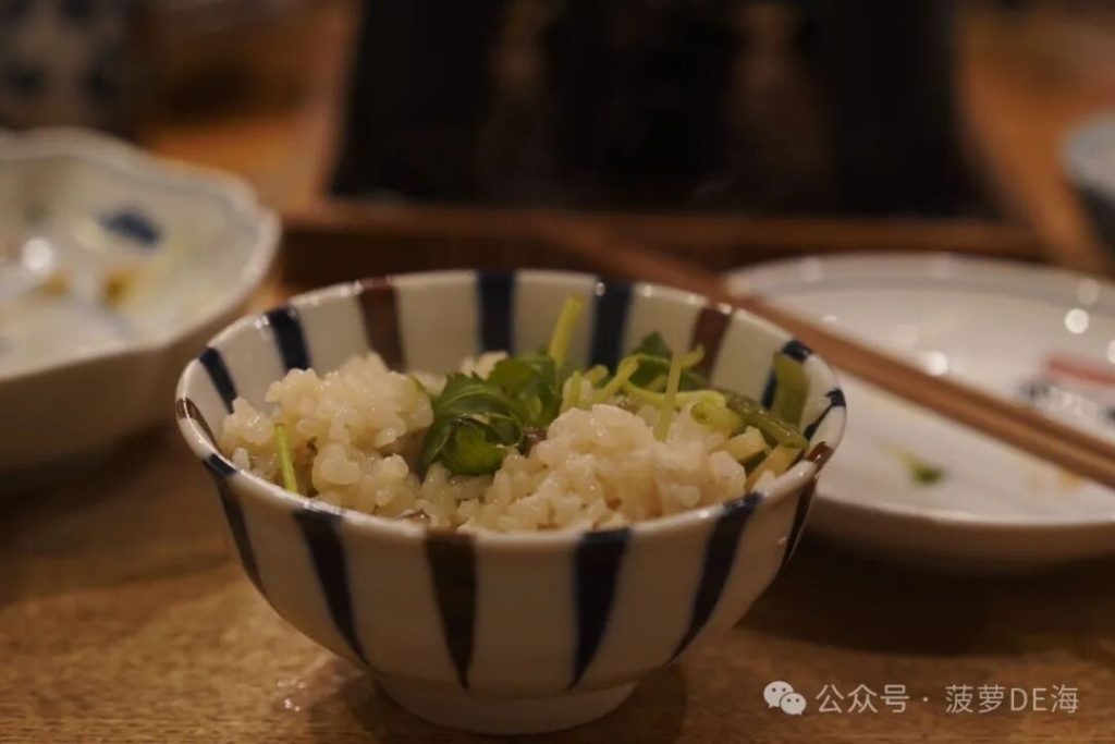 鯛魚山菜釜飯,直接在桌前燃了酒精燈來煮,等酒精燃燒殆盡米飯也已煮好。用高湯來做煮飯的湯汁,配上蕨菜等時令蔬菜,拌勻後鮮甜豐富。另配了一碟調味用的菜葉,嘗了嘗香氣介乎芹菜葉和香菜葉之間。