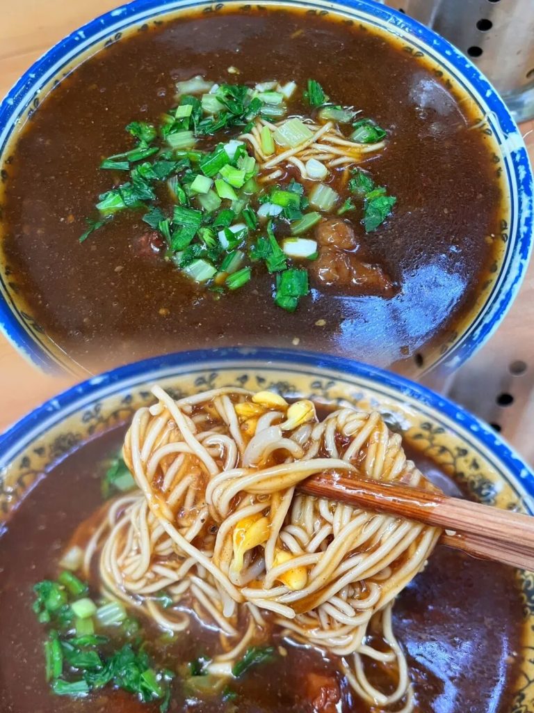 牛肉面:它是糊糊狀的湯,我只能說尊重但不理解,想嘗試一下的點個小碗就夠了,我點了個中碗,完全吃不下。