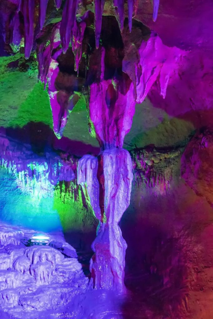 山東地下大峽谷是一座風貌奇特的溶洞王國,洞體長度6100米。洞內峽穀深切,石筍、石柱、鍾乳石等遍布其中,在燈光的映照下,呈現出五彩斑斕的景象。
