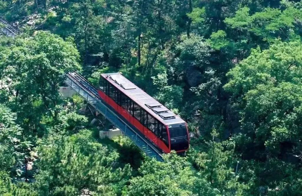 隨著列車緩緩行駛,耳邊循環著悠揚的《沂蒙山小調》,山風從車窗溜進來。不用費力爬山,就能直達山頂。