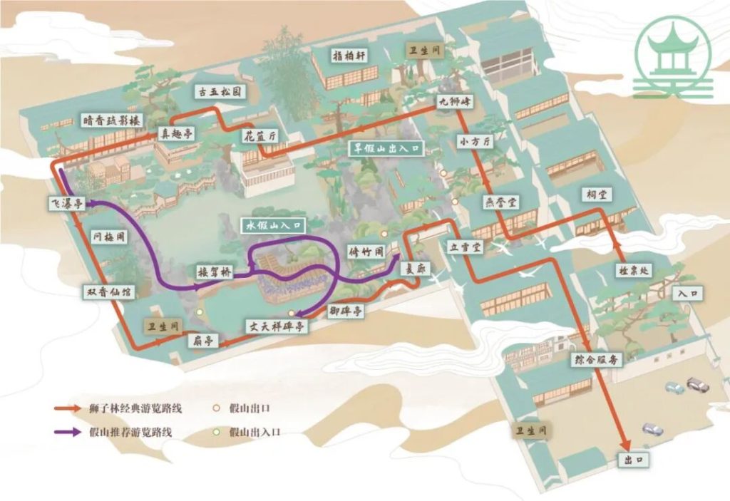 入口→燕譽堂→小方廳→九獅峰→真趣亭→石舫→暗香疏影樓→假山群(走假山推薦路線:水假山入口進,經換駕橋、修竹閣等)→立雪堂→出口