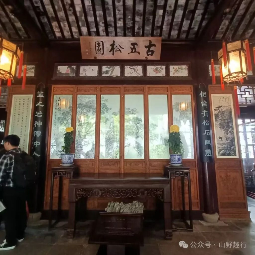 古五松園是因清康熙時獅子林內有五棵參天古松,故獅子林又名五松園,現為東西向廳堂,“古五松園”匾額由蘇局仙題,匾額下得吳致木先生作絹質五松聯屏一幅。
