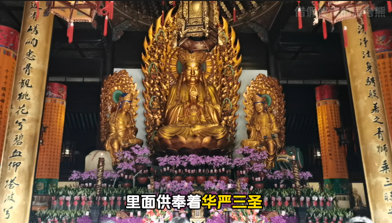 第三進為大雄寶殿,裏面供奉著華嚴三聖:法身佛毗盧遮那佛像左右兩邊分別是文殊菩薩和普賢菩薩
