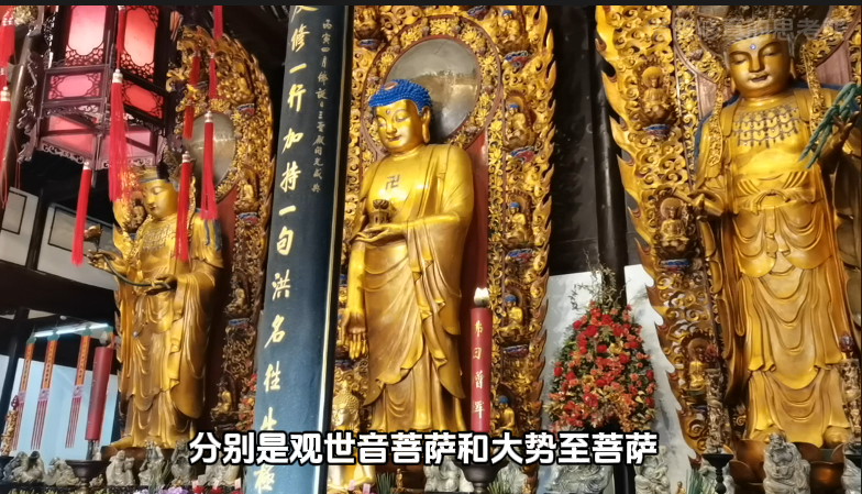 第四進是三聖殿供奉著西方三聖,分別是:西方極樂世界阿彌陀佛,阿彌陀佛的左右兩側分別是觀世音菩薩和大勢至菩薩。