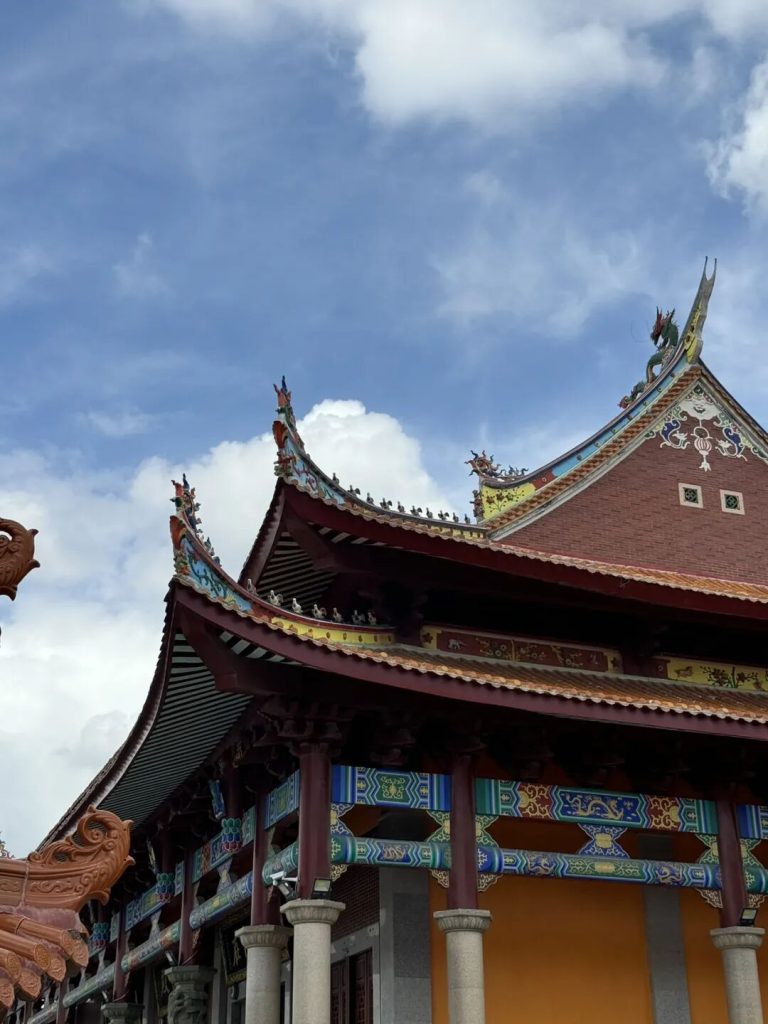 寺廟建築融合了閩南古建築特色與佛教文化,采用傳統的木結構和琉璃瓦屋頂,紅牆綠瓦、飛簷翹角,雕梁畫棟、金碧輝煌。