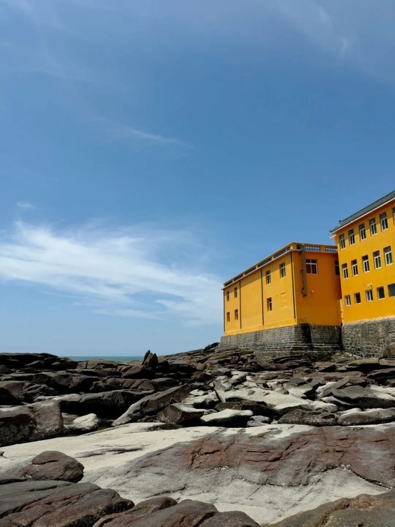 此刻的寺廟,金黃色的外立面,極具閩南特色的飛簷,靜靜立在海嶼島上,漲潮後的海水漫過灘塗,讓它看起來像是憑空浮在碧波之上,紅牆綠瓦在烈日下閃著溫潤的光,與澄澈的藍天、湛藍的海面連成一片。