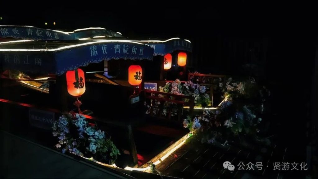 雖說甪直古鎮擁有2500年曆史,卻長期面臨“白天熱鬧、夜晚冷清”的困境。2024年4月,甪直古鎮聯合文旅企業推出“錦夜·青靛甪直”夜遊項目,通過光影技術、實景演藝、非遺互動等形式,將千年古鎮的江南故事表演給觀眾,有《青靛甪直》《醉花邀》《水上飛火》等震撼節目。夜遊門票59元/人,這裏有景區內唯一民宿——拾心之境,位於江南文化園內,步行3分鍾直達夜遊入口,入住即可免費欣賞夜間光影秀。