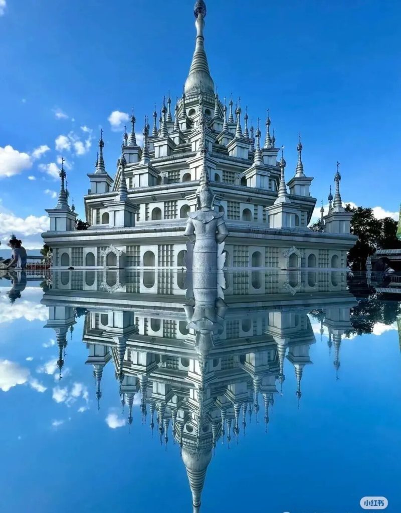 同樣位於雷讓山,離金塔就步行十幾分鍾,這裏的顏色和金塔交相輝映,雪白的塔寺隨手拍都非常美,特別有異域風情。還有可以打卡的天空之境、網紅天梯,拍個照還是不錯的。以純白色為基調,與金塔形成鮮明對比。塔高66米,擁有鏡面倒影池,構成"天空之鏡"效果。