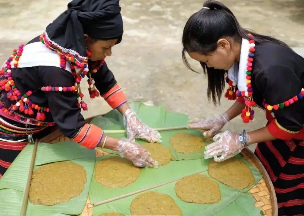 潑水粑粑是潑水節必不可少的一種傳統小吃,以芭蕉葉、糯米粉、紅糖等原材料制成。其口感松軟香甜而富有彈性,糯米的黏軟與紅糖的甜蜜完美融合,而芭蕉葉賦予了它清新的香氣,三者搭配,風味獨特,食之唇齒留香,令人回味。