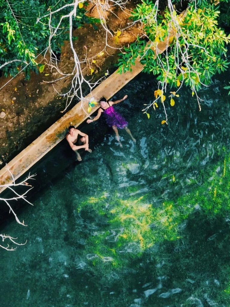 它藏在一棵巨大的百年榕樹底下,榕樹根部已經全部石化,池水清澈見底,陽光穿過層層樹葉灑下來,波光粼粼,美到心都化了~