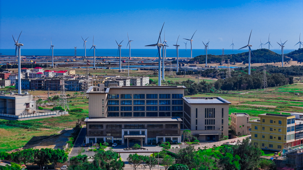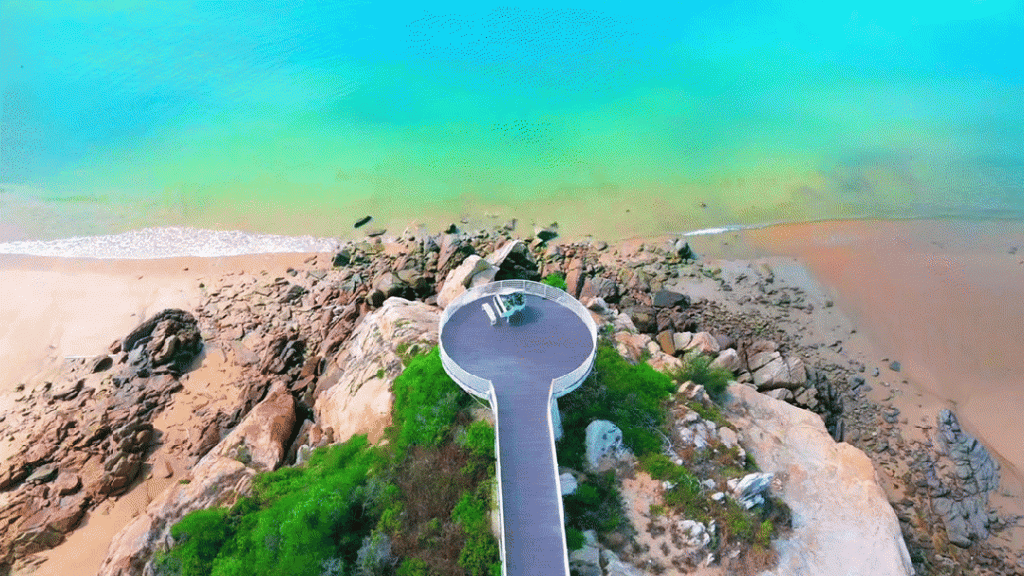 岸邊椰林錯落,與藍色海平面構成清新畫卷,沙灘上設有很多拍照打卡裝置,西側觀景平台可俯瞰漁港全景