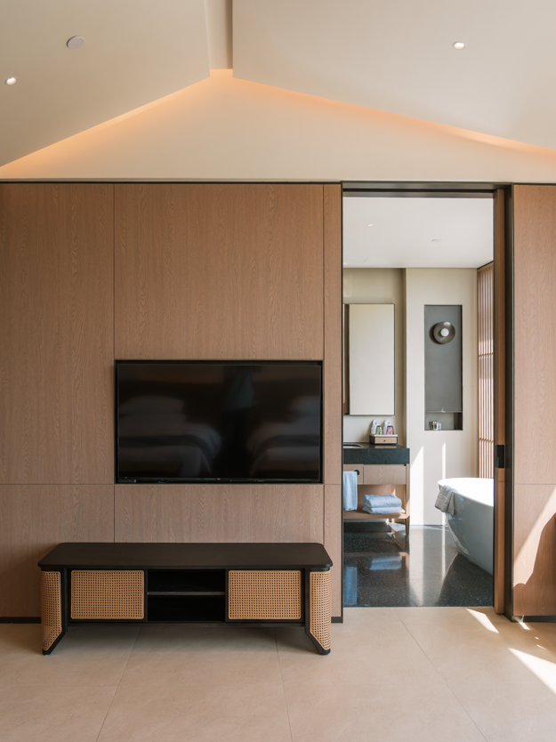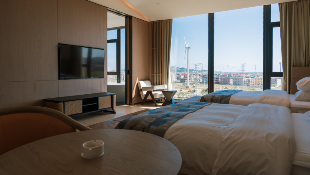我們入住的是海景房標間,房間空間竟然有50㎡+,雖然說有兩張床,但整個空間還是很大、房間配套也非常齊全,在房間用智能語音就可以操控整個房間的燈光、窗簾、電視等。