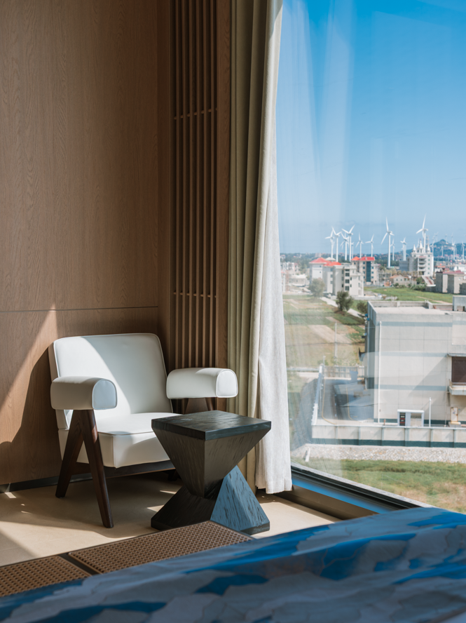 兩個房間都帶有一面全景落地玻璃窗,廁所還帶有一個大浴缸。無論書躺在床上還是在浴缸裏泡澡都可以看到窗外的大片風車海,景色別提多美了