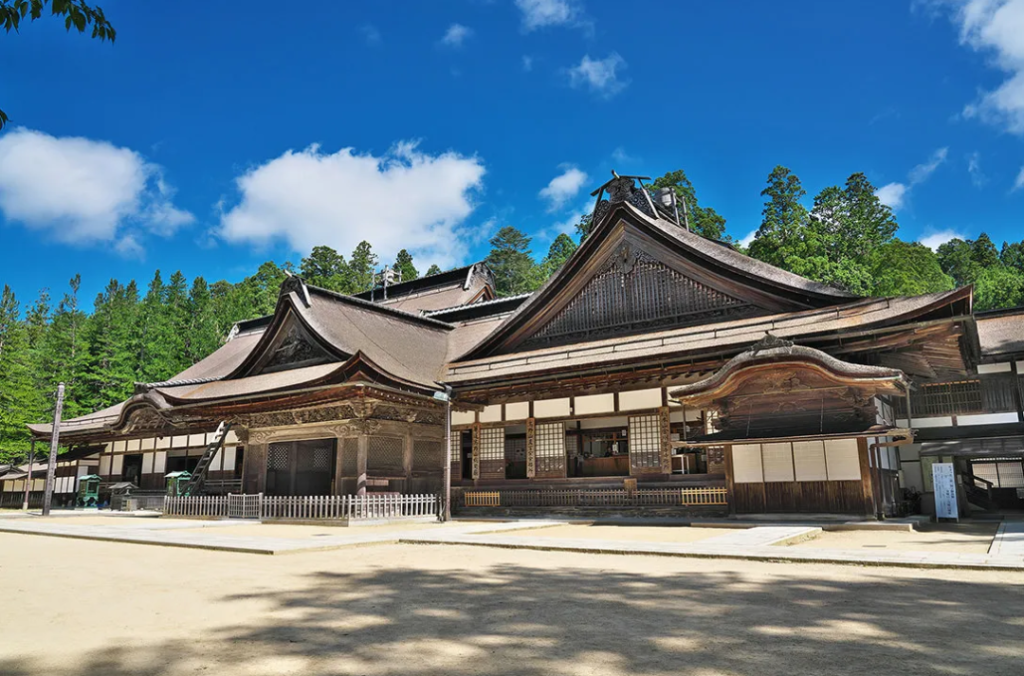 為了國家安泰與世界和平,弘法大師空海立志在深山中建造便於弟子與後人修行的道場。相傳,正在尋找密宗修行場的空海遇到了帶著白黑二犬的明神,並被帶到了高野山,這是一塊被海拔1000米群山包圍的山間盆地。公元816年,他的願望得以實現,當時的嵯峨天皇賜予了這塊土地,弘法大師空海便在此開始了真言宗總道場的建設之路。