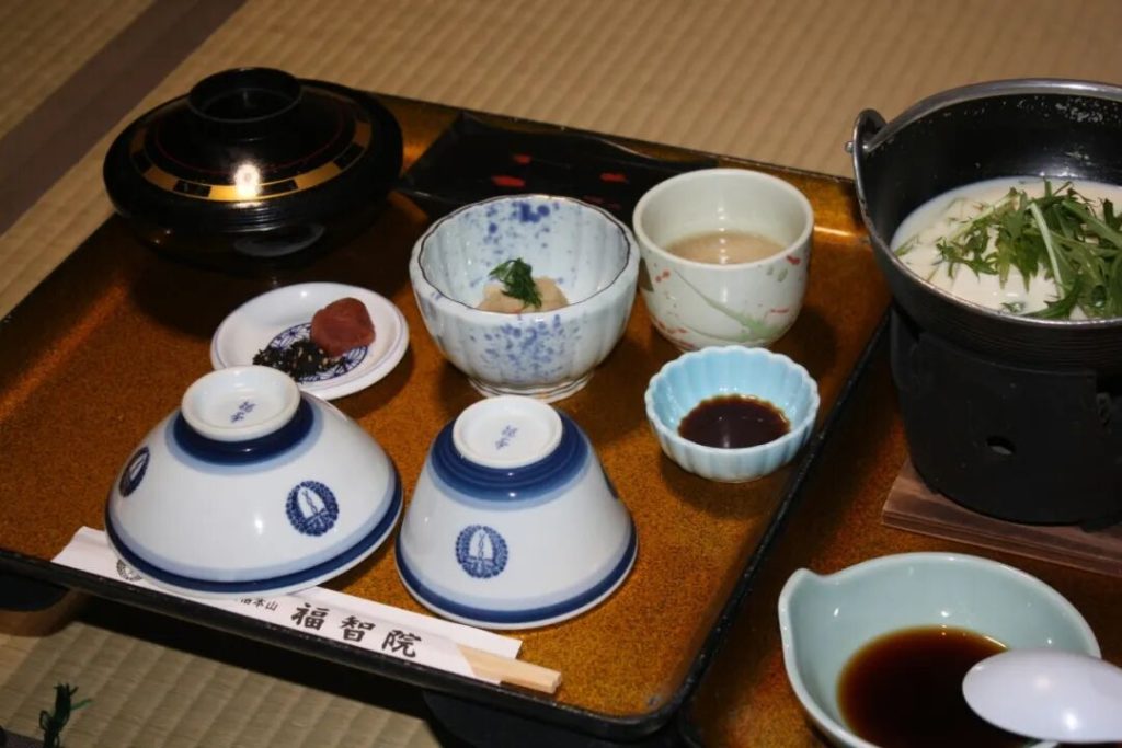 高野山上提供住宿的寺院一般都會為住宿者提供早晚兩餐的精進料理,這是一種基於佛教戒律,避免殺生與使用刺激煩惱的食材而誕生的素食料理,是隨佛教由我國傳入日本。不過料理規格也分檔次,比如簡餐為一個托盤,高等為三個托盤。食材均采用當季的時令蔬菜,不會使用過於繁瑣的烹飪方式,注重體現食材最原始的風味。