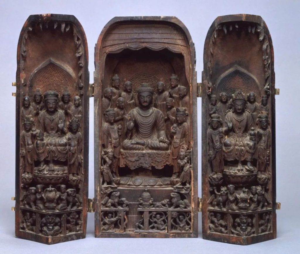 高野山靈寶藏品超5萬件,其中21件為國寶、148件重要文化財產。最受人關注的莫過於弘法大師空海從中國請來的諸尊佛龕,整體分為三部分,均由檀香木制成,各部分用鉸鏈連接,兩側可以關上便於攜帶。畫面上的如來與周圍各式菩薩雕工精致,細節如今依然可見。這件作品無論是設計還是雕工,均可見大唐工匠的精湛技藝,也令當時本土匠人爭相學習。