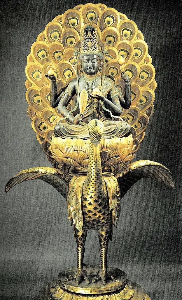 這座原收藏於金剛峯寺的孔雀明王像是1200年由佛教雕刻家運慶的弟子快慶,應後鳥羽隱天皇的要求建造。雕塑為孔雀伸展開雙翼,明王端坐其上的造型,精美地展現了明王與孔雀的神態。明王右側第一只手執蓮華,第二只手持瓜果;左側第一只手持石榴,第二只手則握有孔雀尾翎,細節精致,充分體現了佛雕師的雕刻工藝。