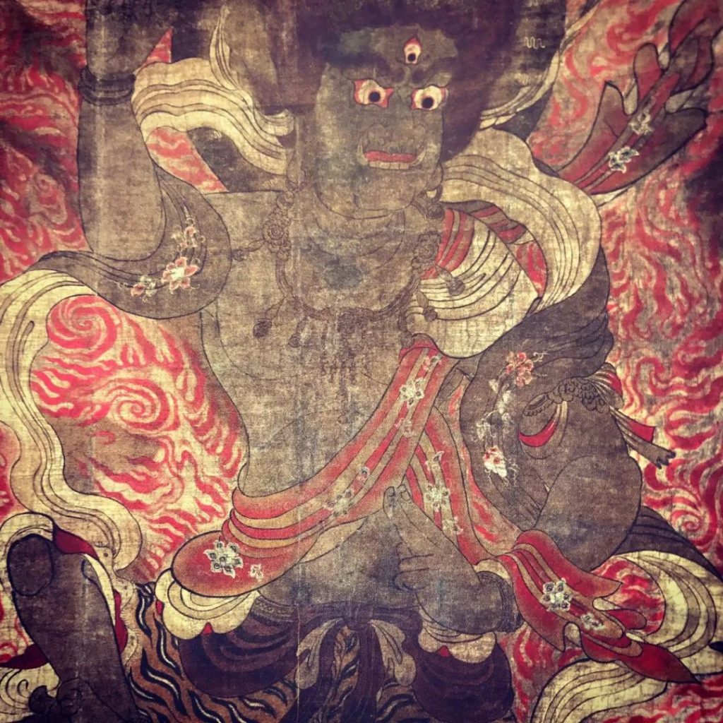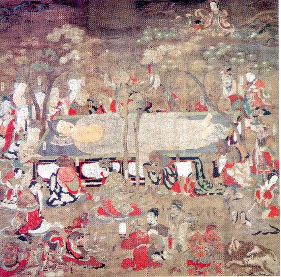 靈寶館中的國寶除了雕塑還有畫。這幅《佛涅槃圖》描繪了釋迦摩尼在沙羅雙樹下圓寂的情景。相傳,這幅畫的創作時間為1086年,是眾多涅槃畫中現存最古老的作品。加之畫面優雅,在人物的表現手法也非常生動,是日本佛教繪畫中最偉大的代表作之一。靈寶館中還藏有國寶繪畫《阿彌陀聖衆來迎図》和《五大力菩薩像金剛吼》。